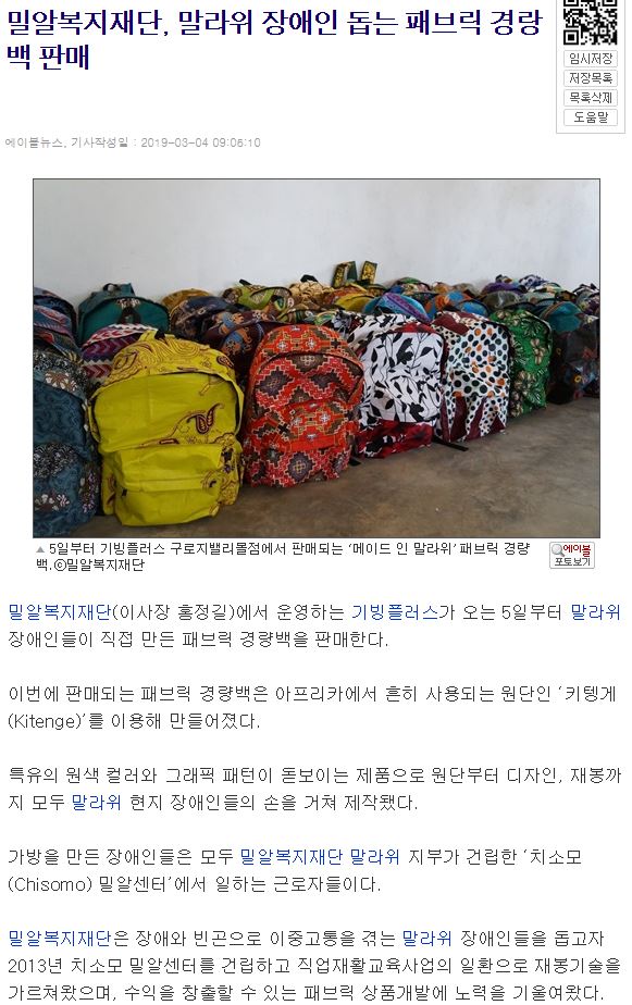 [시사타임즈] 밀알복지재단, 말라위 장애인 돕는 패브릭 경량백 판매