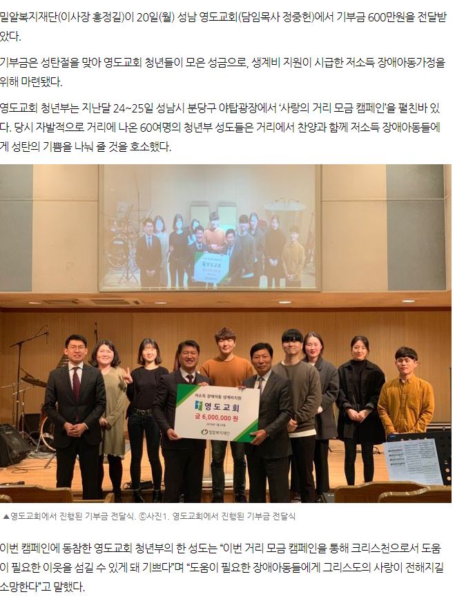 [기독인뉴스] 성남 영도교회 밀알복지재단에 기부금 600만원 전달