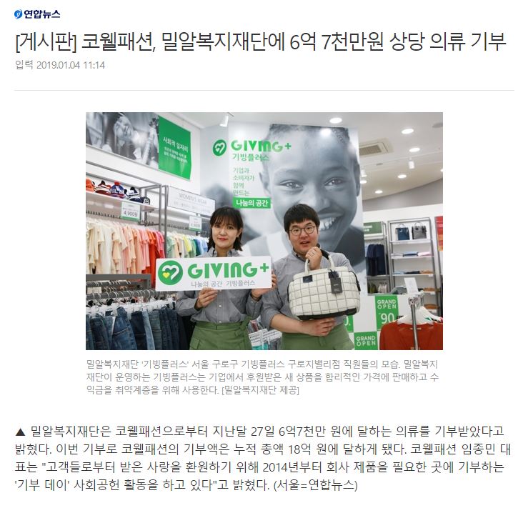 [연합뉴스] [게시판] 코웰패션, 밀알복지재단에 6억 7천만원 상당 의류 기부