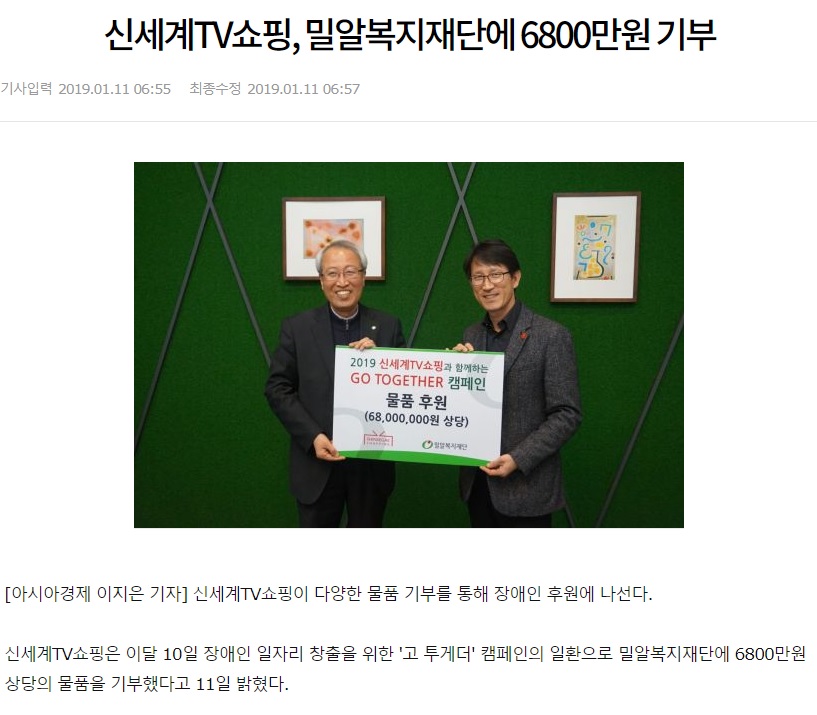 [아시아경제] 신세계TV쇼핑, 밀알복지재단에 6800만원 기부
