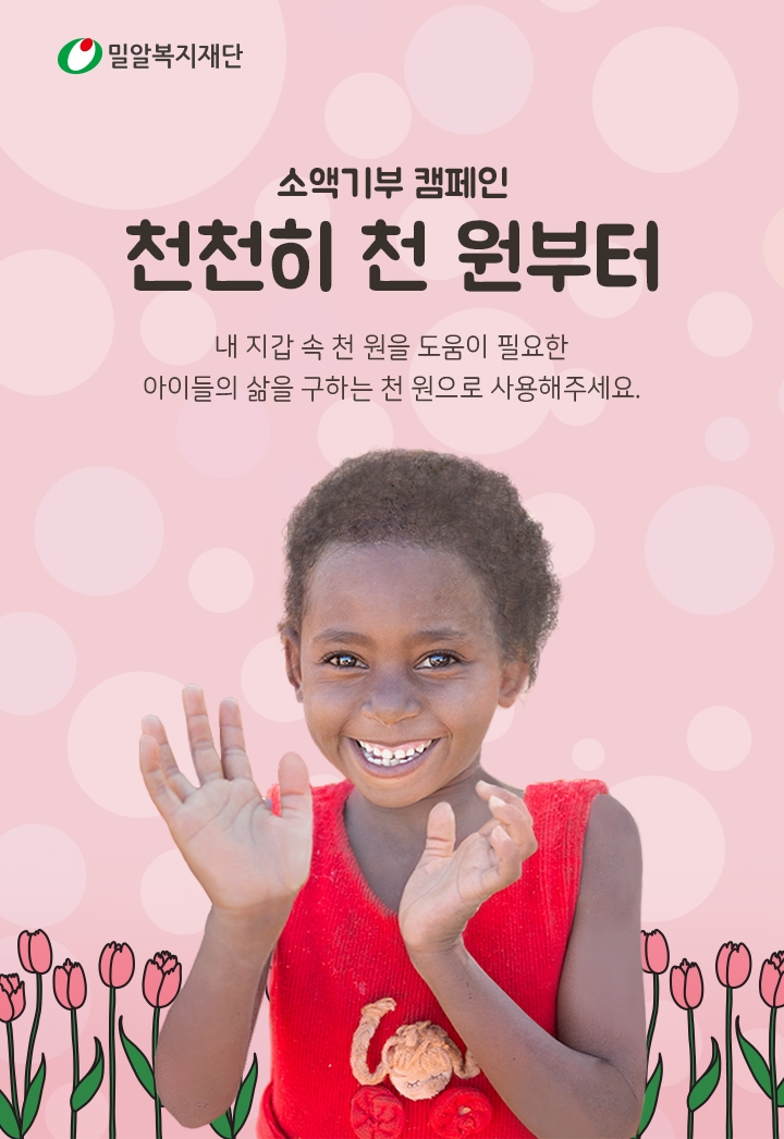 <천천히 천원부터>는 천원부터 정기후원이 가능한 캠페인으로, 금액부담을 낮춰 누구나 쉽게 기부에 참여하게 만들자는 취지로 기획됐다. 후원금은 밀알복지재단의 해외사업장을 통해 빈곤아동의 식량지원과 의료지원 등으로 사용된다.