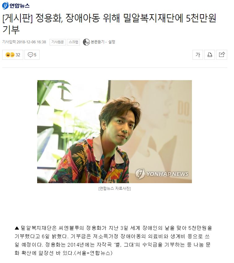 [연합뉴스] [게시판] 정용화, 장애아동 위해 밀알복지재단에 5천만원 기부