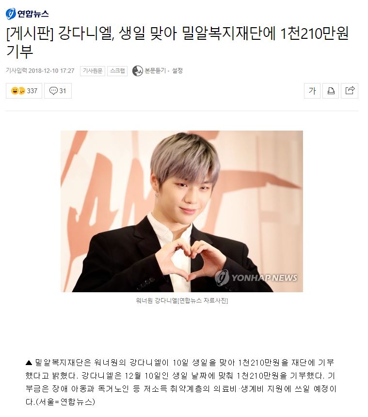 [연합뉴스] 강다니엘, 생일 맞아 밀알복지재단에 1천210만원 기부