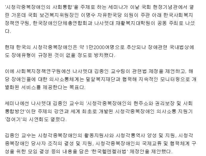 [국민일보] 시청각 중복장애인 위한 ‘한국 헬렌컬러법안’ 제정 공청회