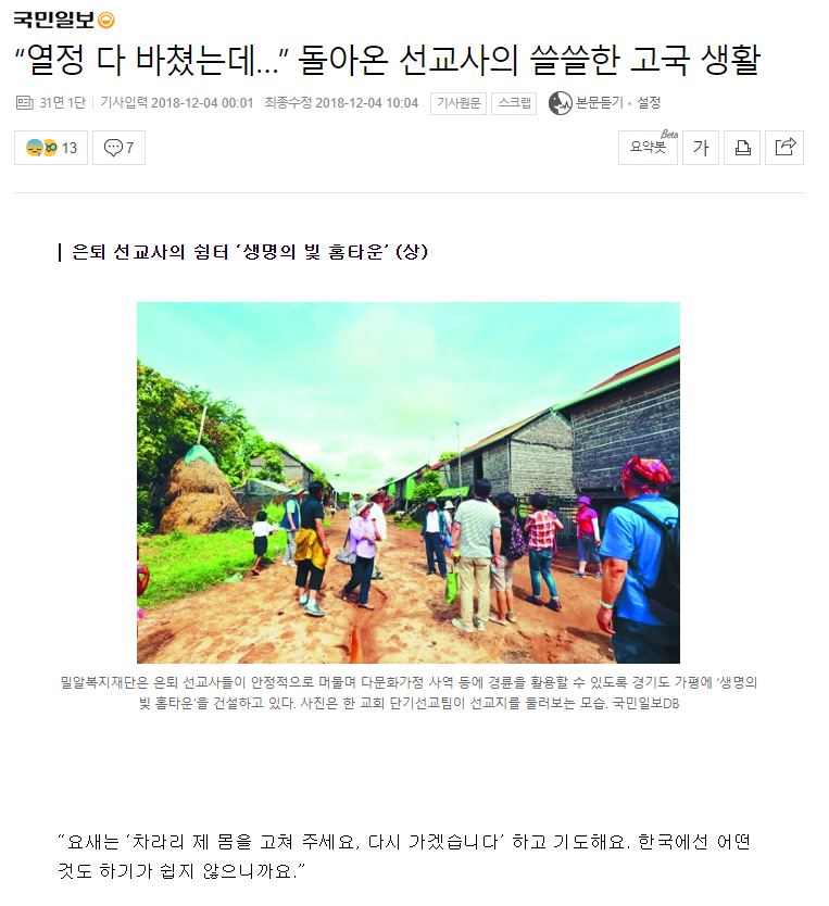 [국민일보] ‘생명의 빛 홈타운’ (상) “열정 다 바쳤는데…” 돌아온 선교사의 쓸쓸한 고국 생활