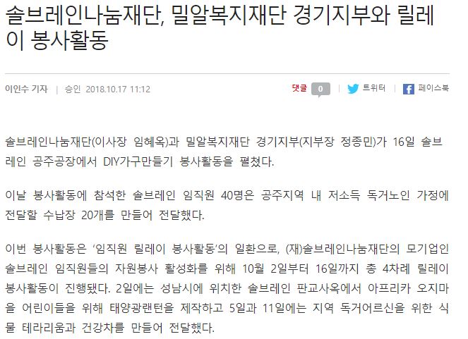 [복지연합신문] 솔브레인나눔재단, 밀알복지재단 경기지부와 릴레이 봉사활동