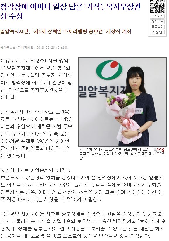 <기적> 이영순 / 제4회 일상속의 장애인-스토리텔링 공모전’ 수상작 소개-①
