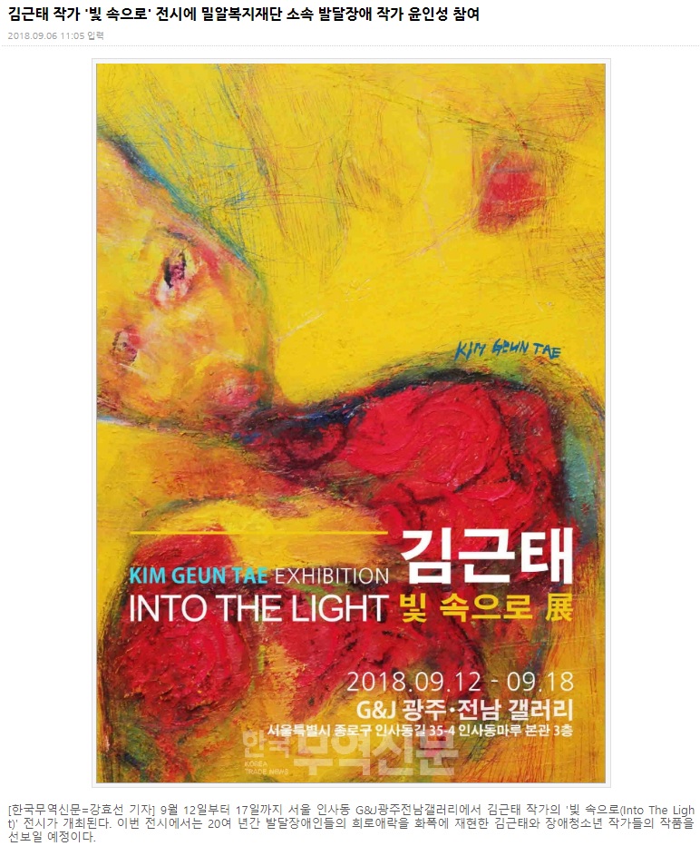 [한국무역신문] 김근태 작가 '빛 속으로' 전시에 밀알복지재단 소속 작가 윤인성 참여[크리스천투데이] 발달장애 작가 윤인성, 김근태 작가 <빛 속으로> 전시 참여[에이블뉴스] 장애인 - 발달장애작가 윤인성, 김근태 작가 전시 참여[기독인뉴스] 밀알복지재단 소속 발달장애 작가 윤인성, 김근태 작가 ‘빛 속으로’[한국사진방송] 발달장애 작가 윤인성, 김근태 작가 ‘빛 속으로’ 전시 참여
