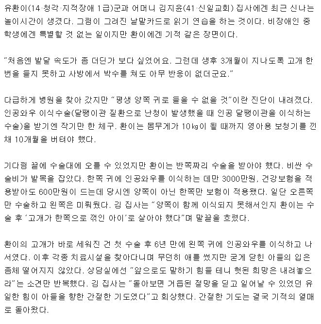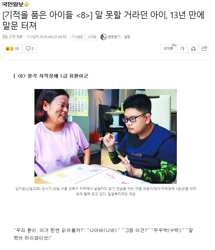 [국민일보] [기적을 품은 아이들 <8>] 말 못할 거라던 아이, 13년 만에 말문 터져