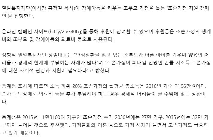 [크리스천투데이] 밀알복지재단, 장애아동 키우는 조부모 가정 위한 캠페인 진행