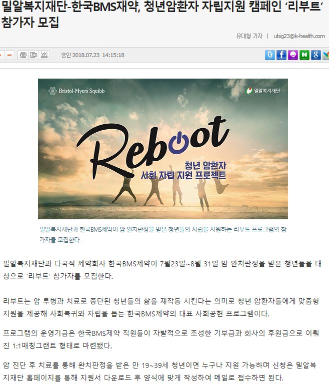 [뉴시스 외] 밀알복지재단-한국BMS제약, 청년암환자 자립지원 캠페인 '리부트' 참가자 모집