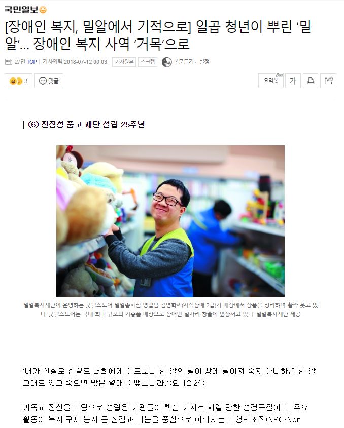 [국민일보] [장애인 복지, 밀알에서 기적으로] 일곱 청년이 뿌린 ‘밀알’… 장애인 복지 사역 ‘거목’으로
