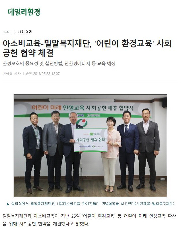 [데일리환경] 아소비교육-밀알복지재단, '어린이 환경교육' 사회공헌 협약 체결