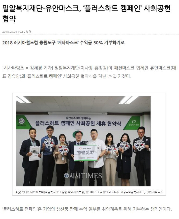 [시사타임즈] 밀알복지재단-유안마스크 '플러스하트 캠페인' 사회공헌 협약