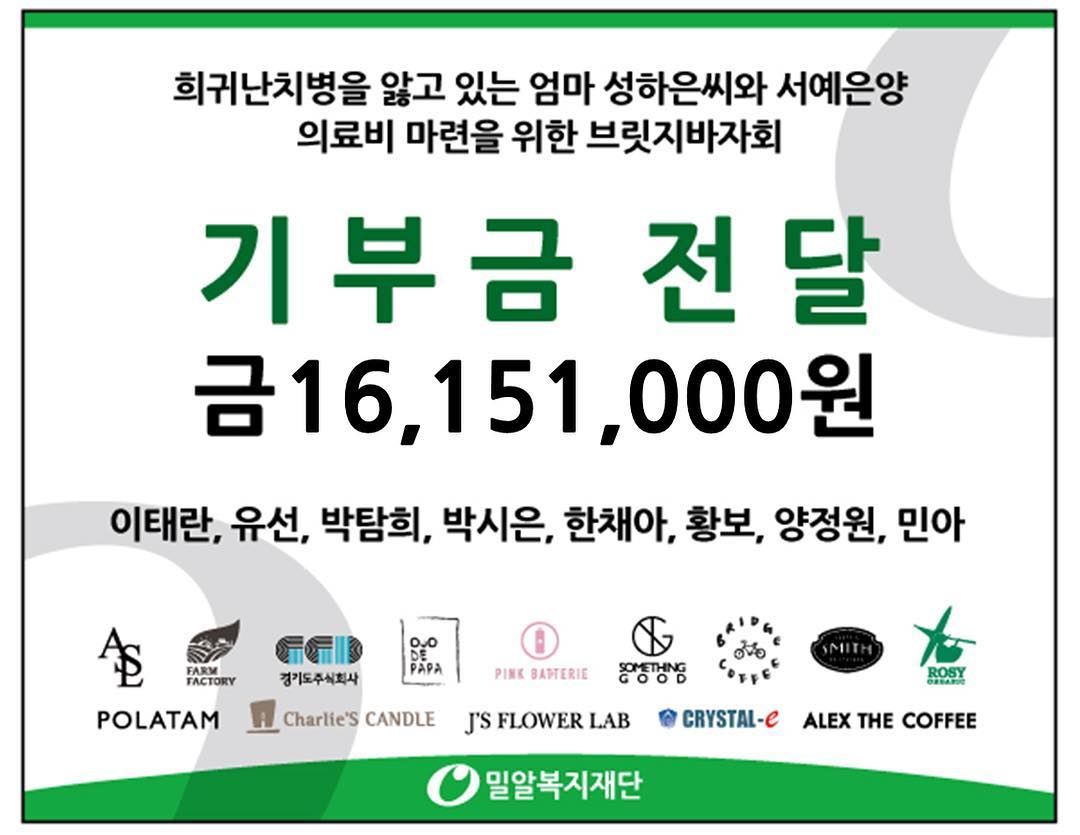 ◎ 수익금 1천6백만원 밀알복지재단에 기부... 하반신마비와 CRPS(복합부위통증증후군) 앓는 엄마 성하은씨와 동맥관개존증 앓는 장애아동 서예은양 모녀의 치료비로 사용될 예정