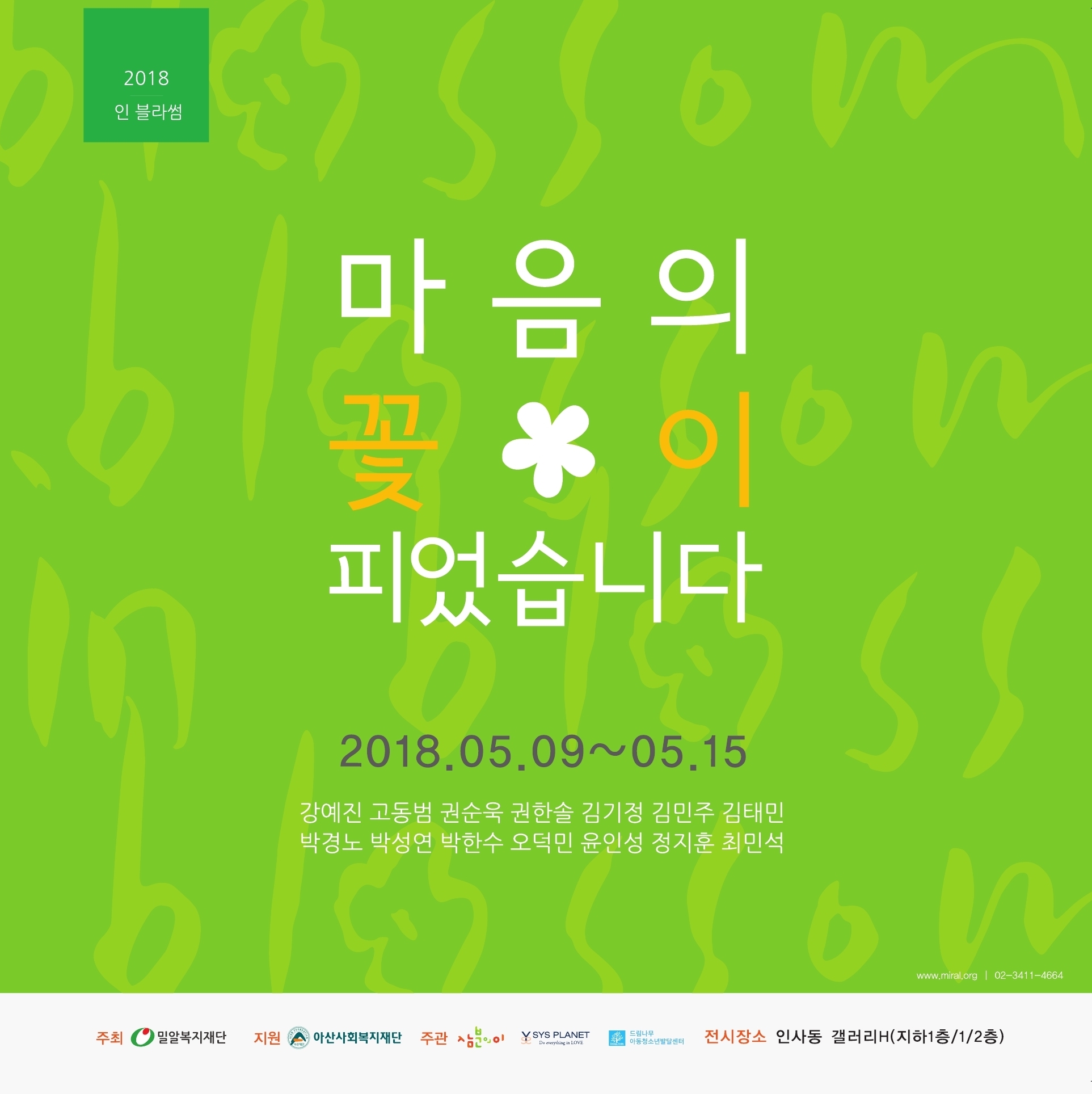 밀알복지재단(이사장 홍정길)이 오는 5월 9일부터 15일까지 인사동 갤러리H에서 ‘2018 인블라썸(in blossom), 마음의 꽃이 피었습니다’ 전시회를 개최한다.