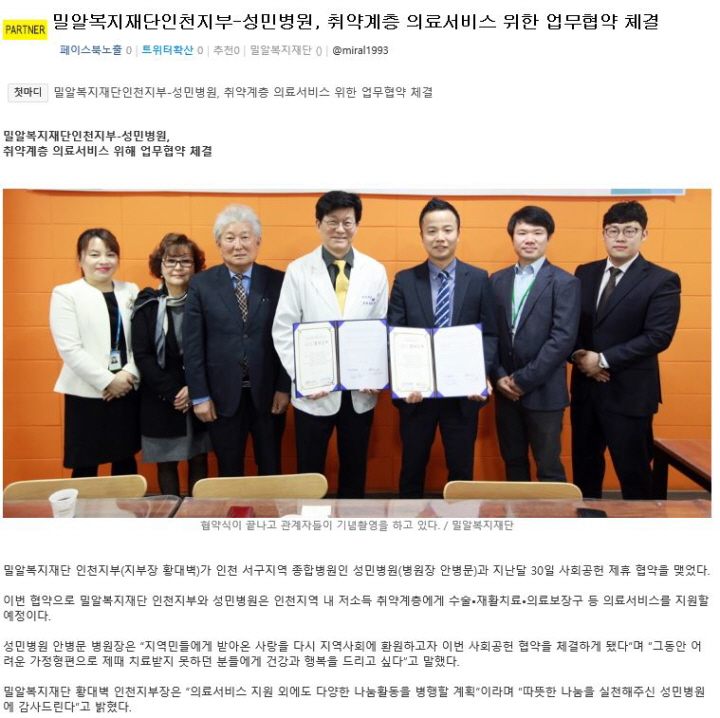 [위키트리] 밀알복지재단 인천지부 - 성민병원, 취약계층 의료서비스 위한 업무협약 체결