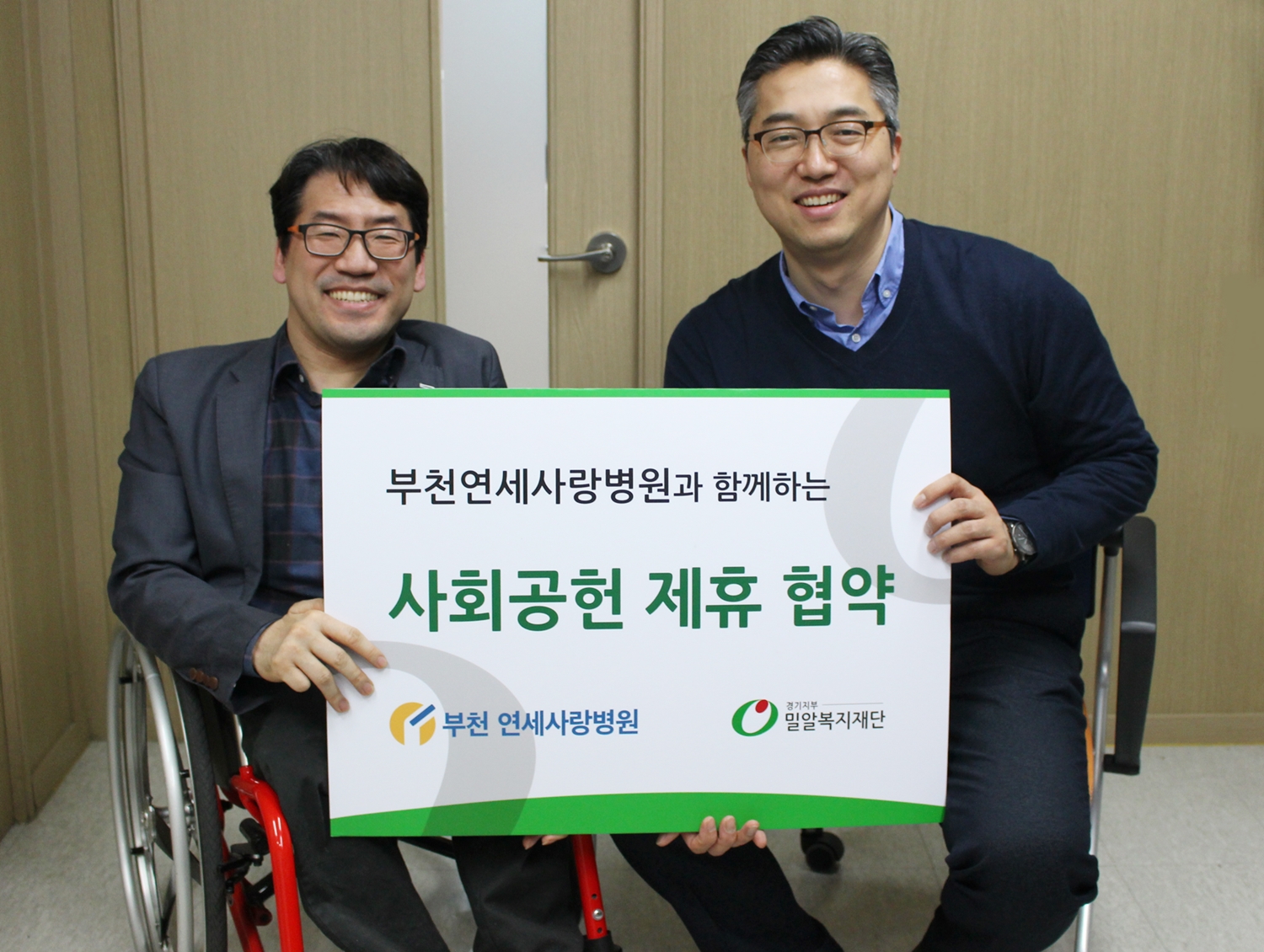 사진1. (왼쪽부터) 밀알복지재단 정종민 경기지부장, 권세광 부천연세사랑병원장