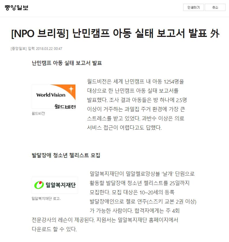 [중앙일보 외 4건] 밀알첼로앙상블 날개, 발달장애청소년 첼리스트 모집