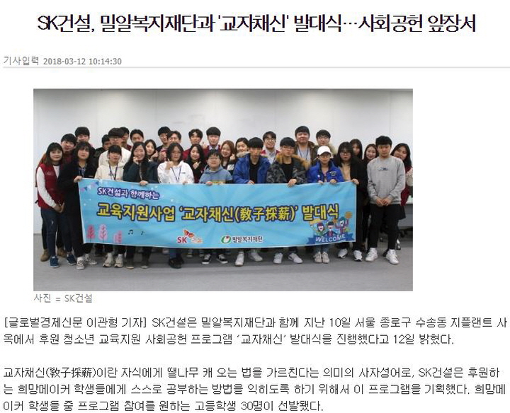 SK건설, 청소년 교육지원 사회공헌 프로그램 '교자채신' 런칭 <세계일보 바로가기>