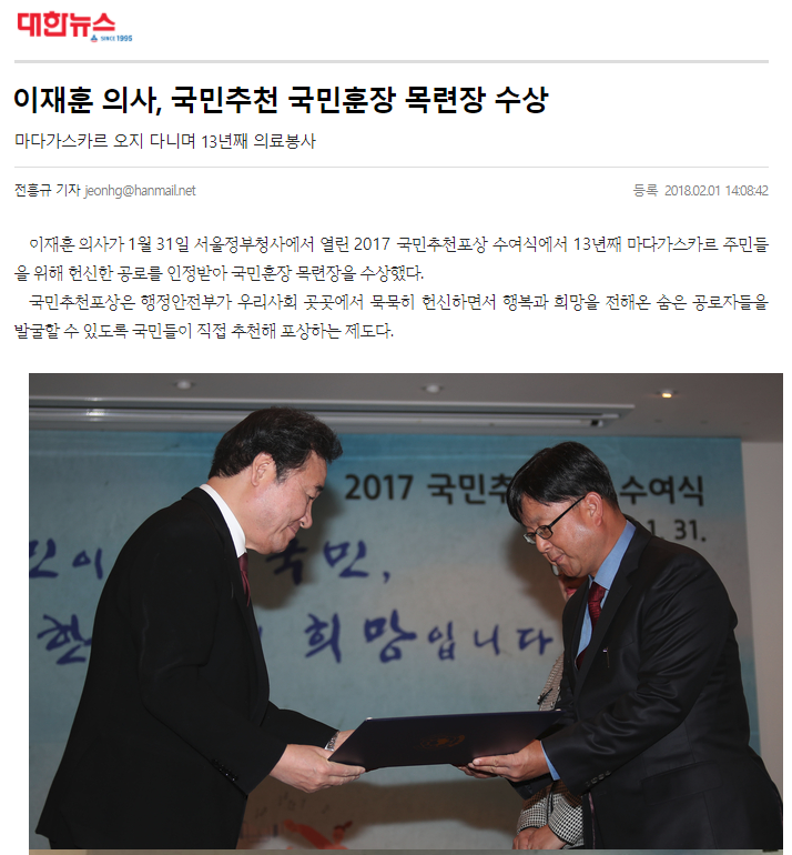 마다가스카르 오지 다니며 13년째 의료봉사 이재훈 의사, 국민훈장 목련장 수상 < e뉴스페이퍼 기사보기>