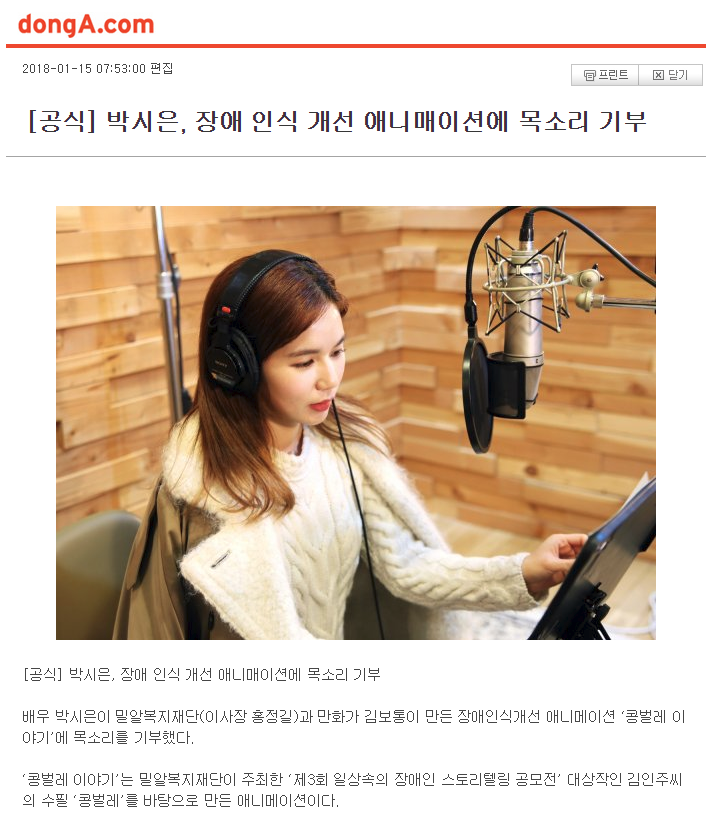 [스포츠동아 외 13건] [공식] 박시은, 장애 인식 개선 애니매이션에 목소리 기부