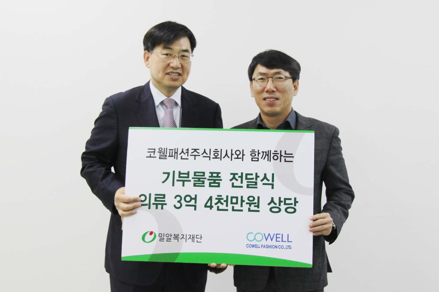 코웰패션(대표 임종민)이 1월 12일 밀알복지재단(이사장 홍정길)에 3억4천만 원 상당의 의류를 기부하고 기부물품 전달식을 가졌다. 지난달부터 1월까지 두 달에 걸쳐 코웰패션이 기부한 의류 총 15만벌은 밀알복지재단에서 운영하는 기빙팩토리에 배분돼 저소득 취약계층을 위해 사용될 예정이다.