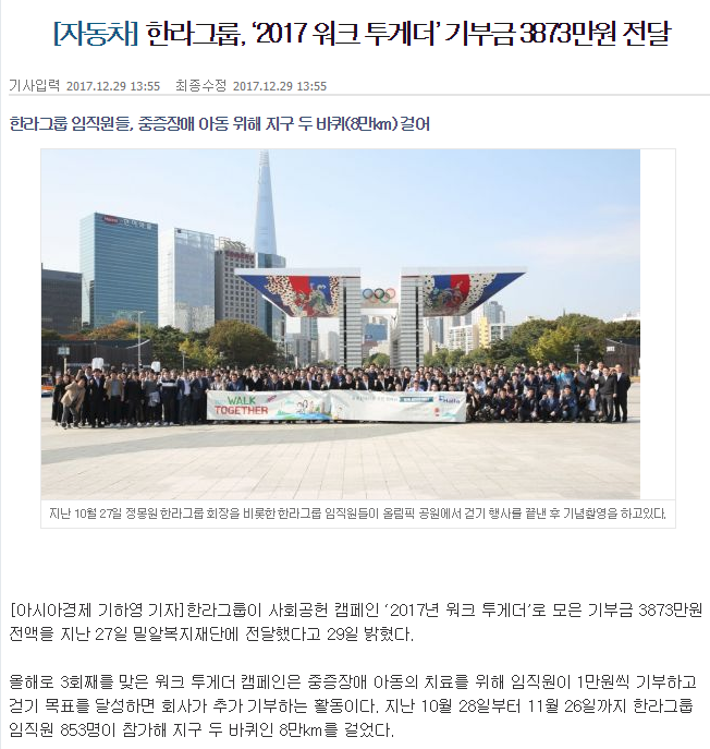 [아시아경제] 한라그룹, ‘2017 워크 투게더’ 기부금 3873만원 전달