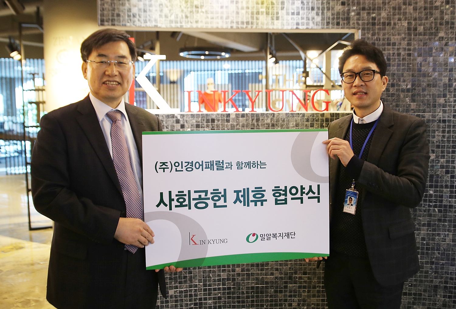 사진1. (왼쪽부터)밀알복지재단 김인종 기획조정실장, ㈜인경어패럴 허철구 상무