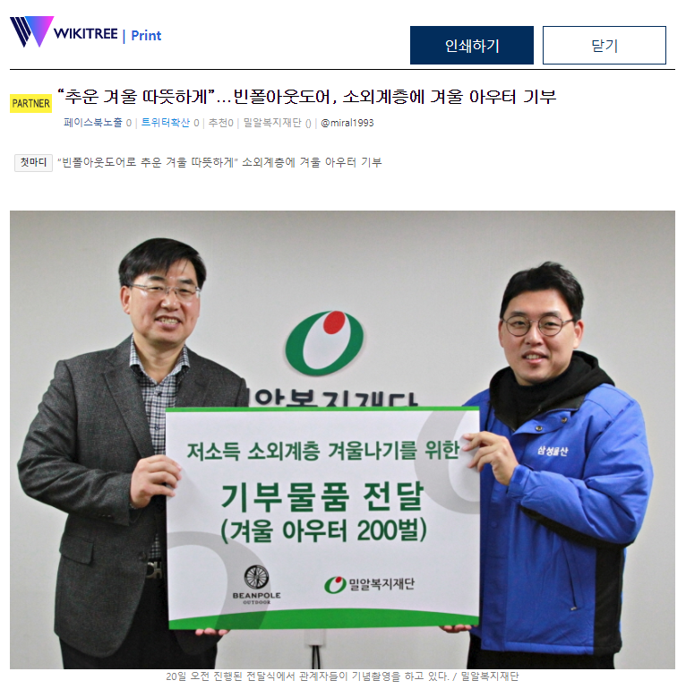 [위키트리] “추운 겨울 따뜻하게”...빈폴아웃도어, 소외계층에 겨울 아우터 기부