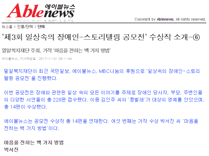[에이블뉴스] ‘제3회 일상속의 장애인-스토리텔링 공모전’ 수상작 소개-⑤