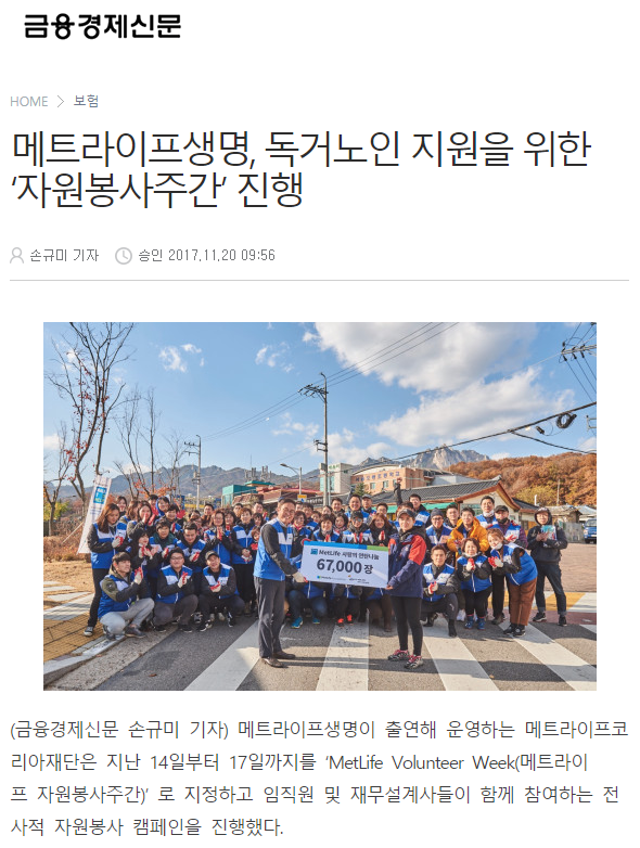 [데일리안] 메트라이프생명, 독거노인 지원 위한 자원봉사주간 진행