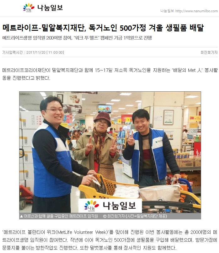 [나눔일보] 메트라이프-밀알복지재단, 독거노인 500가정 겨울 생필품 배달