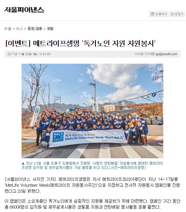 [서울파이낸스] 메트라이프생명 '독거노인 지원 자원봉사'