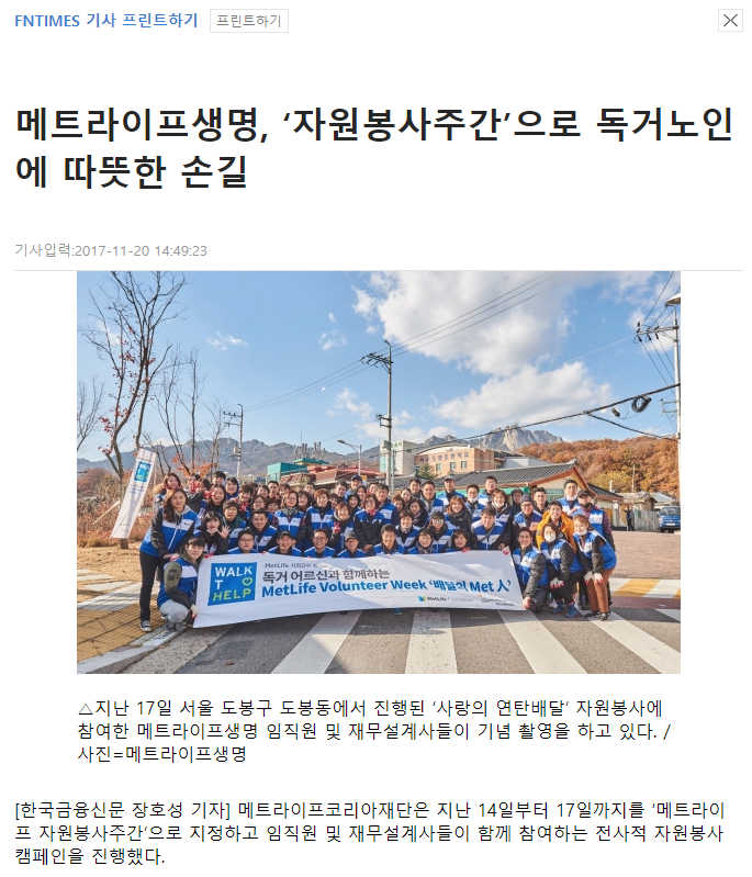 [폴리뉴스] 메트라이프생명, 독거노인 지원 위한 '희망의 자원봉사'