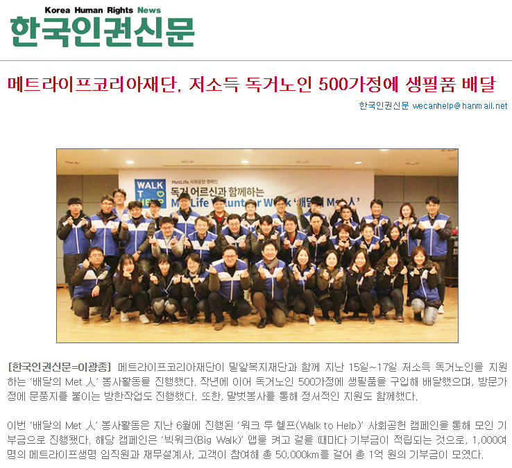 [한국인권신문] 메트라이프코리아재단, 저소득 독거노인 500가정에 생필품 배달
