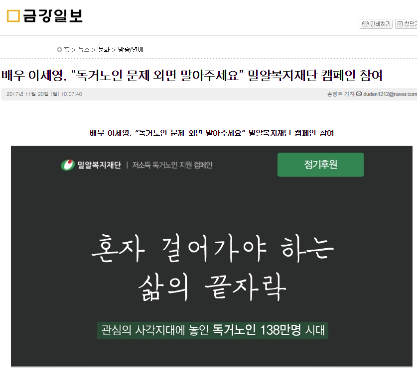 [금강일보] 배우 이세영, “독거노인 문제 외면 말아주세요” 밀알복지재단 캠페인 참여