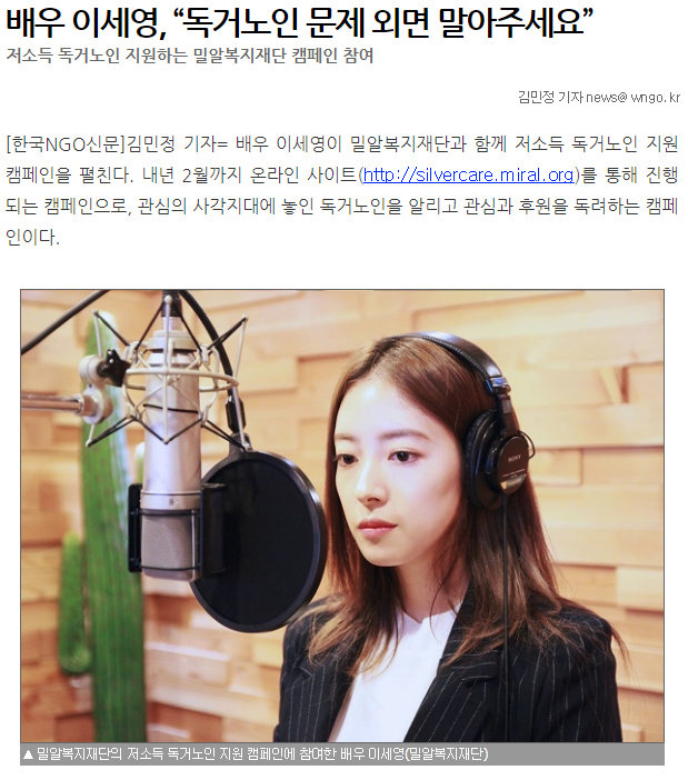[한국NGO신문] 배우 이세영, “독거노인 문제 외면 말아주세요”
