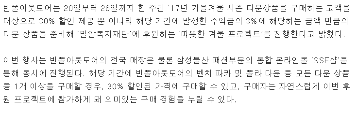 [브릿지경제] 빈폴아웃도어 "옷 구매하고 사랑 전하세요"