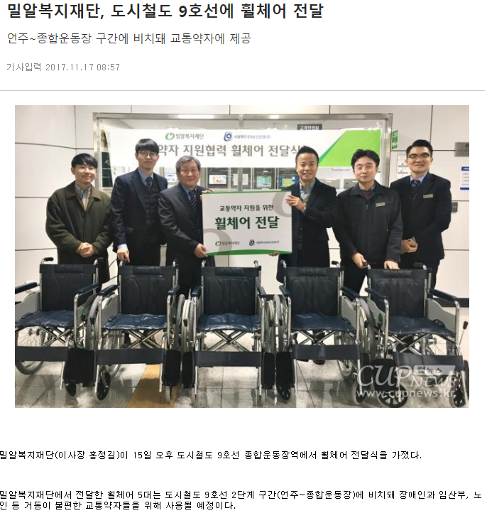 [보도자료] 밀알복지재단, 도시철도 9호선에 휠체어 전달