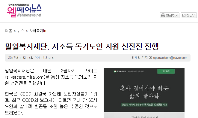 [기독인뉴스] 밀알복지재단 저소득 독거노인 위한 캠페인 열어