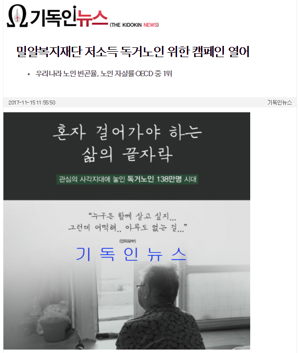 [기독인뉴스] 밀알복지재단 저소득 독거노인 위한 캠페인 열어