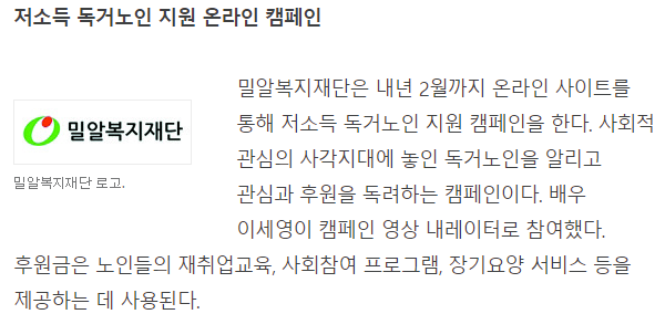 [뉴스타운] 밀알복지재단, ‘저소득 독거노인 지원 캠페인’에 배우 이세영 재능기부