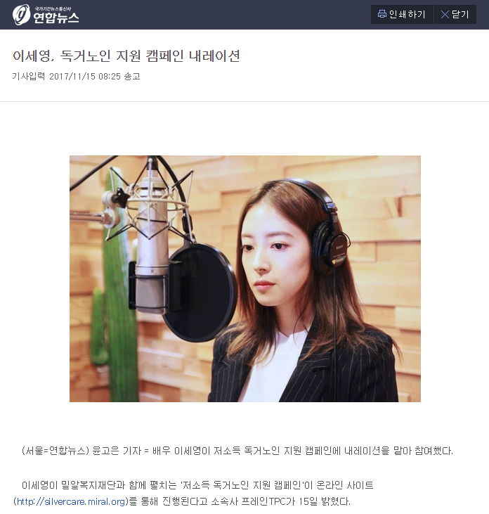 [연합뉴스] 이세영, 독거노인 지원 캠페인 내레이션