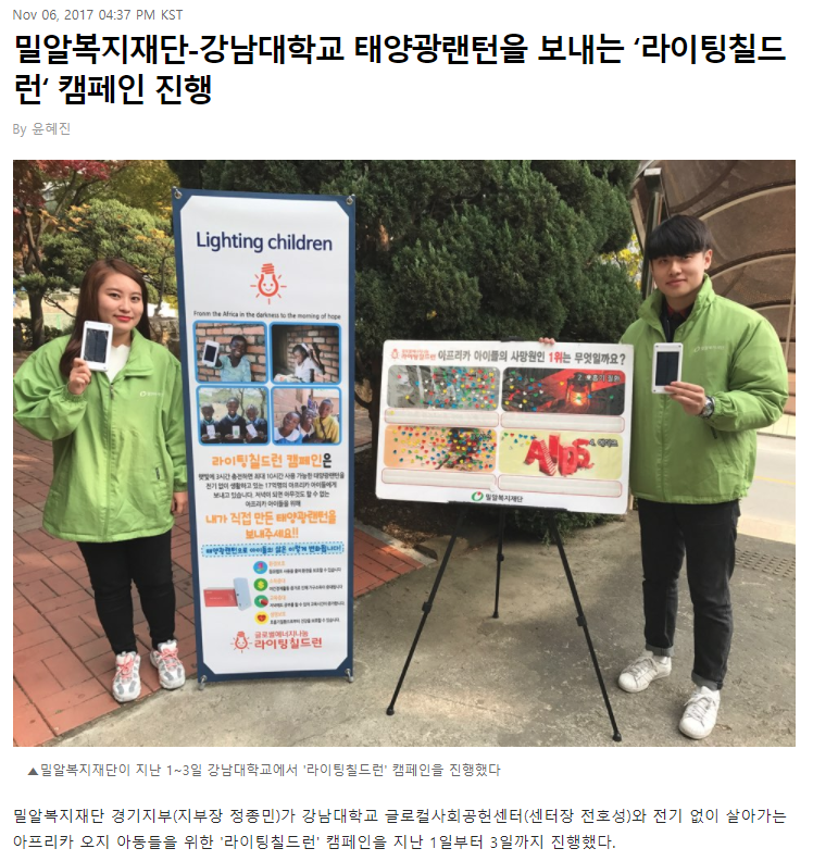 [크리스천투데이] 밀알복지재단-강남대학교 태양광랜턴을 보내는 ‘라이팅칠드런‘ 캠페인 진행