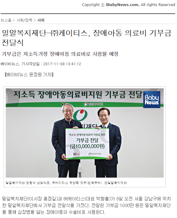 [베이비뉴스] 밀알복지재단-㈜케이티스, 장애아동 의료비 기부금 전달식