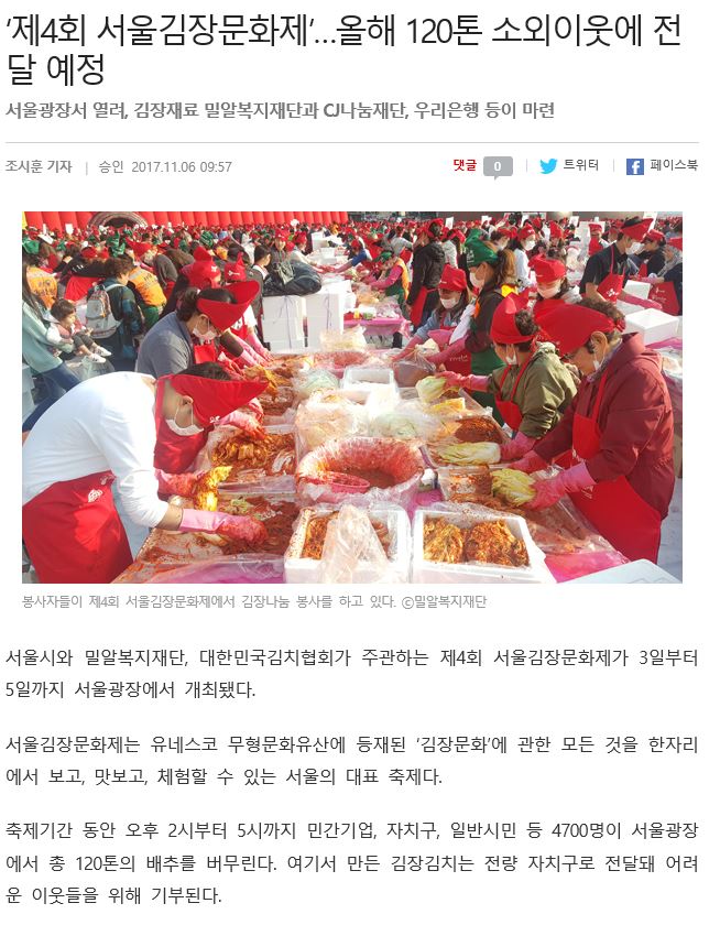 [복지연합신문] ‘제4회 서울김장문화제’…올해 120톤 소외이웃에 전달 예정