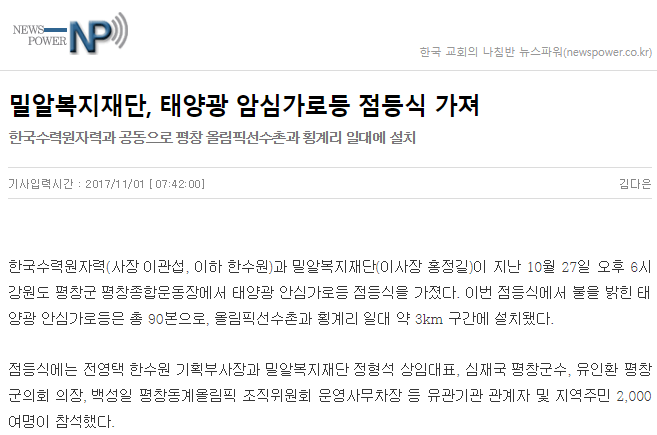 [크리스천투데이] 밀알복지재단-한수원, 경주시에 태양광 안심가로등 설치