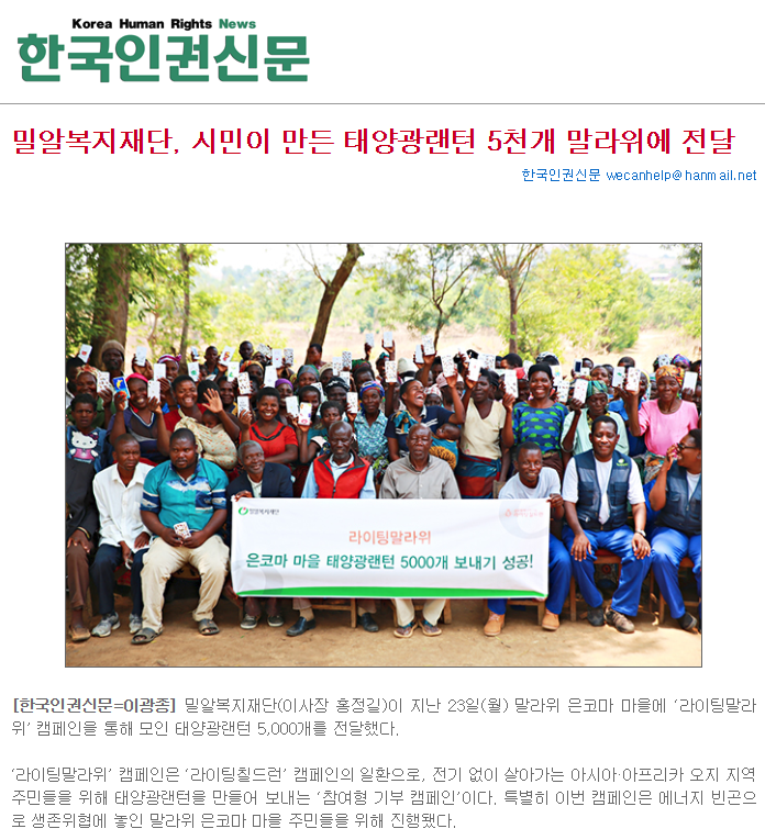 [한국인권신문] 밀알복지재단, 시민이 만든 태양광랜턴 5천개 말라위에 전달