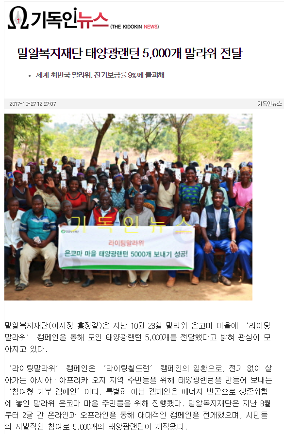 [국민일보] ‘희망의 빛이 되기를’ 밀알복지재단, 말라위 은코마 마을에 태양광랜턴 5000개 전달